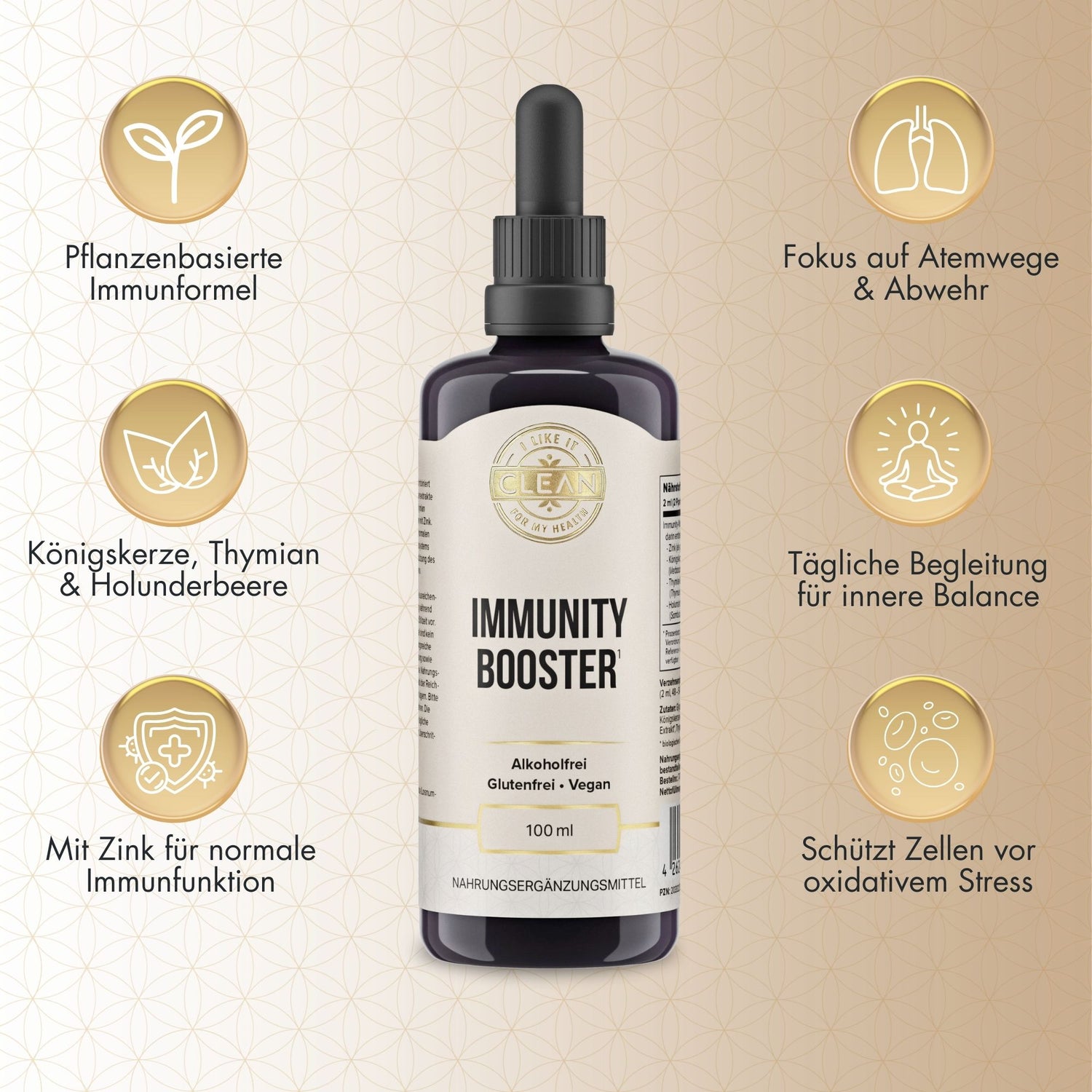 Der Immunity Booster ist alkoholfrei, vegan, glutenfrei und ohne Gentechnik hergestellt. Als Träger dient pflanzliches Glycerin aus Bio-Leinsamen. Die flüssige Darreichungsform ermöglicht eine einfache und flexible Anwendung im Alltag.